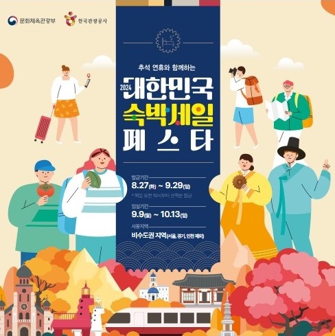 - 8월 27일 오전 10시부터 비수도권 지역 대상 숙박할인권 20만 장 선착순 배포- 9월 9일부터 10월 13일까지 입실 숙박상품에 사용 가능